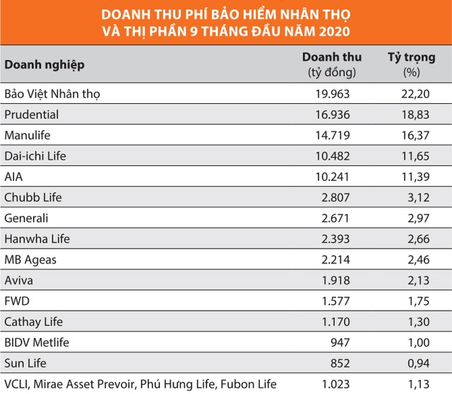 Trong 9 tháng đầu năm 2020, tổng doanh thu phí bảo hiểm nhân thọ khai thác mới toàn thị trường ước đạt 28.159 tỷ đồng, tăng 17% so với cùng kỳ năm trước. Tốp đầu về doanh thu vẫn là những tên tuổi quen thuộc, đó là Manulife với 5.619 tỷ đồng, Bảo Việt Nhân thọ 4.190 tỷ đồng, Prudential 3.851 tỷ đồng, Dai-ichi Life 3.393 tỷ đồng, AIA 3.244 tỷ đồng.