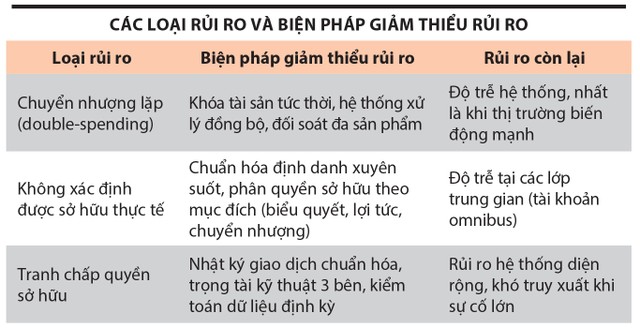 Biện pháp giảm thiểu rủi ro: Áp dụng cơ chế khóa tài sản tức thời khi tham gia giao dịch; đồng thời tích hợp hệ thống giao dịch và lưu ký theo mô hình đồng bộ (synchronous). Việc kiểm soát xuyên suốt giữa các lớp sản phẩm cũng cần được thiết lập, tránh việc sử dụng lặp tài sản ở nhiều “kênh”.