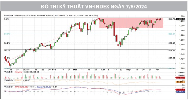 VN-Index tiếp tục diễn biến giằng co trong tuần qua khi chỉ số có điều kiện tiệm cận vùng kháng cự 1.290 - 1.300 điểm trong 4 phiên giao dịch gần nhất. Dù chưa có sự bứt phá mới nhưng vẫn ghi nhận một tuần tăng điểm và trạng thái vận động của thị trường trong tuần qua được củng cố bởi tâm lý giao dịch ổn định dần trước các chuyển biến “dễ thở” hơn từ các yếu tố vĩ mô. Điển hình như dữ liệu kinh tế vĩ mô tháng 5 và 5 tháng đầu năm 2024 tiếp tục ghi nhận có nhiều cải thiện tích cực và tiếp tục củng cố cho triển vọng hồi phục.