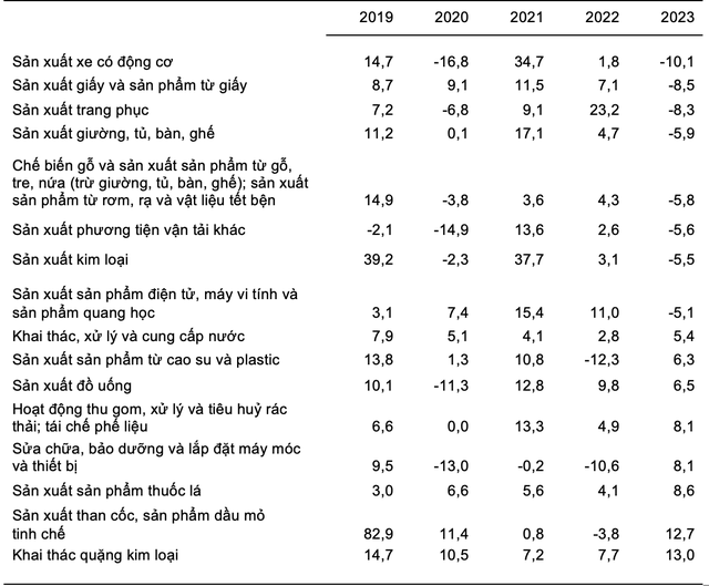 Trong đó, so với cùng kỳ năm trước, ngành chế biến, chế tạo giảm 0,5%; ngành khai khoáng giảm 2,9%; ngành sản xuất và phân phối điện tăng 5%; ngành cung cấp nước, hoạt động quản lý và xử lý rác thải, nước thải tăng 6,8%.