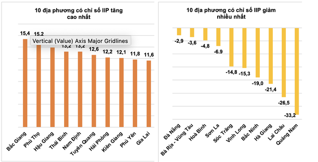 Ở chiều ngược lại, một số địa phương có chỉ số IIP tăng thấp hoặc giảm do ngành công nghiệp chế biến, chế tạo; ngành khai khoáng và ngành sản xuất, phân phối điện giảm.
