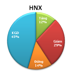 Số mã tăng trên HNX là 37 (chiếm 9,4% trong tổng số 394 mã niêm yết), số mã giảm là 57 số mã đứng giá là 39 và không có giao dịch là 261 mã.