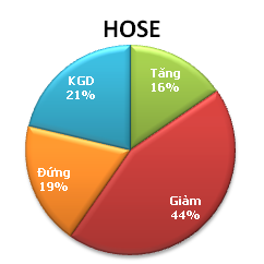 Trong số 310 cổ phiếu niêm yết trên HOSE, có 45 mã tăng (chiếm 14,5%), 64 mã giảm, 59 mã đứng giá và 142 mã không có giao dịch.