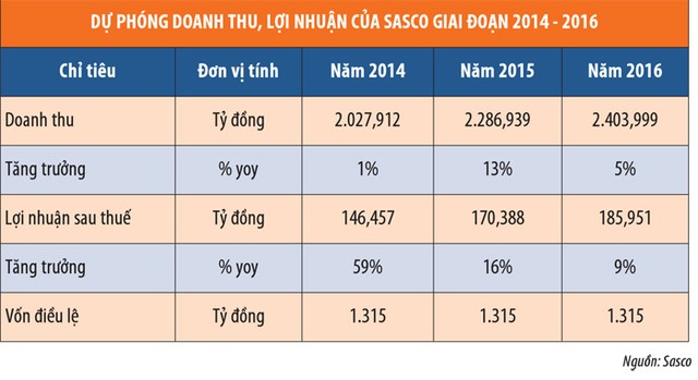 Sasco hiện có cơ cấu tài chính lành mạnh với lượng tiền và tương đương tiền dồi dào (30% tổng tài sản), hệ số nợ chịu lãi vay thấp (7%), khả năng quản lý vốn lưu động tốt. Dự phóng các chỉ tiêu tài chính quan trọng của Công ty trong giai đoạn 2014 - 2016 có sự tăng trưởng khá. Đến năm 2016, doanh thu của Công ty kỳ vọng đạt trên 2.403 tỷ đồng và lợi nhuận sau thuế đạt 185,95 tỷ đồng.