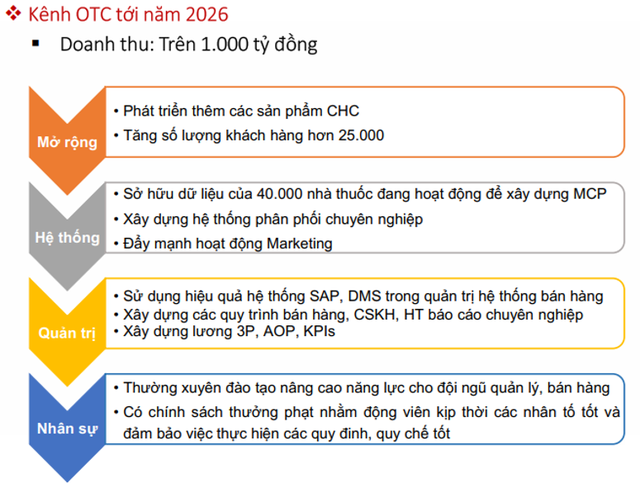 Theo chiến lược, Bidiphar sẽ đạt doanh thu kênh OTC năm 2026 trên 1.000 tỷ đồng thông qua phát triển thêm các sản phẩm CHC, tăng số lượng khách hàng lên trên 25.000.