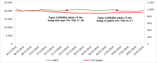 Trong bối cảnh thị trường chứng khoán Việt Nam vẫn diễn biến phức tạp và chỉ trong vòng chưa đầy 1 tháng, SBT đã phải điều chỉnh giá 2 lần vào ngày 24/12/2018 và 14/1/2019 cho 2 đợt chi trả cổ tức với tổng giá trị điều chỉnh lên tới 10% thị giá, tuy nhiên, SBT vẫn đảm bảo sự tăng trưởng ổn định và tốt hơn Vn-Index.