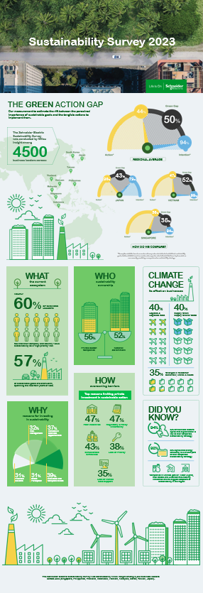 Ông Đồng Mai Lâm, Tổng giám đốc Schneider Electric Việt Nam và Campuchia chia sẻ: “Chúng ta nhìn thấy sự gia tăng tích cực trong nhận thức và cam kết của doanh nghiệp Việt trong việc thiết lập các mục tiêu bền vững. Tuy nhiên, khảo sát chỉ ra rằng vẫn còn nhiều việc phải làm để thu hẹp khoảng cách giữa ý định và hành động. Rất nhiều tổ chức có thể đang theo đuổi tính bền vững, nhưng vẫn thiếu một lộ trình tổng thể, và đang chỉ tập trung vào các mục tiêu ngắn hạn, thay vì vạch ra một hành trình bền vững. Các lãnh đạo doanh nghiệp cần phân bổ nguồn lực hợp lý hơn, khi mà xu hướng ESG sẽ đòi hỏi rất nhiều thay đổi”.