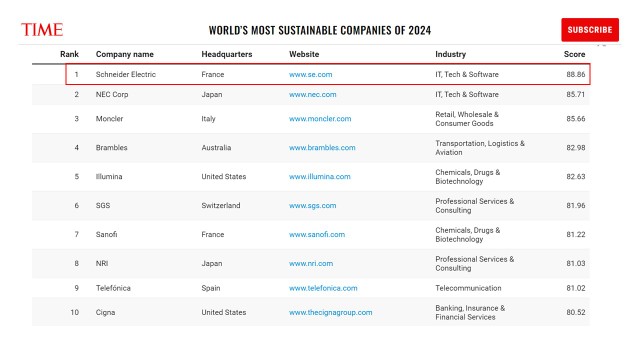 Chia sẻ về Schneider Electric, Tạp chí TIME và Statista nhấn mạnh tính chuyên môn cao về công nghệ của tập đoàn và chương trình Tác động Bền vững Schneider - Schneider Sustainability Impact (SSI). Chương trình chuyển đổi này thúc đẩy và đo lường tiến độ của tập đoàn hướng tới các mục tiêu bền vững toàn cầu giai đoạn 2021-2025, đóng góp vào sáu cam kết dài hạn bao gồm tất cả các khía cạnh môi trường, xã hội và quản trị (ESG) cũng như mức độ trung hòa carbon vào năm 2025, thúc đẩy nỗ lực của Schneider Electric trong việc chống biến đổi khí hậu, bất bình đẳng xã hội và hiện thực hóa các cam kết địa phương.