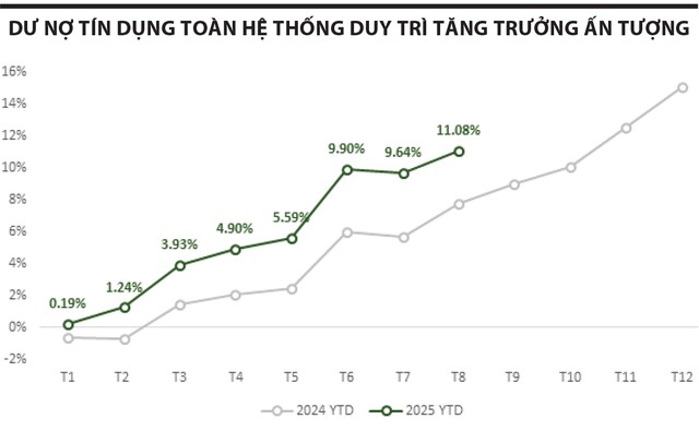 Tín dụng toàn hệ thống tiếp tục bứt tốc, đạt 11,08% tính đến cuối tháng 8. So với cùng kỳ 12 tháng, mức tăng lên tới 20,19% - cao nhất trong nhiều năm, vượt xa tốc độ thông thường khoảng 14 - 15%. Với đà này, mục tiêu tăng trưởng tín dụng 16% cho cả năm gần như chắc chắn sẽ hoàn thành.