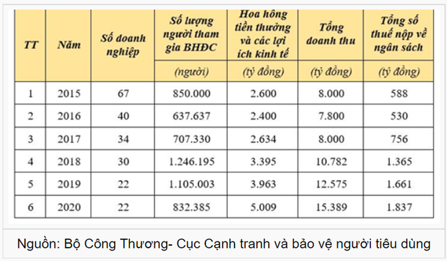 Theo số liệu của Bộ Công thương, trong giai đoạn 2015 - 2020, số lượng doanh nghiệp bán hàng đa cấp tại Việt Nam có xu hướng giảm mạnh, từ 67 doanh nghiệp vào thời điểm cuối năm 2015, xuống chỉ còn 22 doanh nghiệp vào cuối năm 2020. Thị trường bán hàng đa cấp những năm qua liên tục được siết chặt nhằm thanh lọc và tạo sân chơi bình đẳng, đúng nghĩa cho ngành này phát triển.