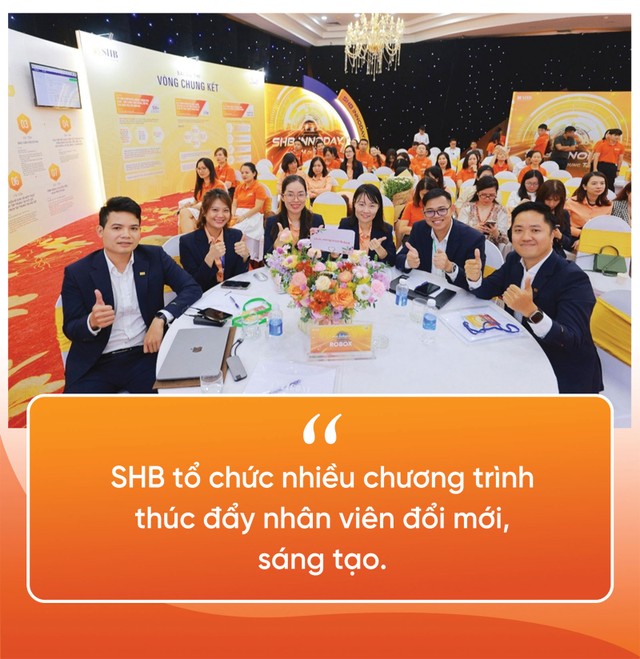 - Đầu tư vào đào tạo và phát triển nhân viên: Với hơn 370.000 giờ đào tạo và trung bình mỗi nhân viên có gần 70 giờ đào tạo hàng năm, SHB không chỉ coi trọng mà còn đầu tư vào nguồn nhân lực. SHB đã nhận giải thưởng “Nơi làm việc tốt nhất châu Á” và giải “Ngân hàng vì con người” - những minh chứng cho cam kết gắn kết nhân viên, tạo nên văn hóa “Tâm - Tin - Tín - Tri - Trí - Tầm”.