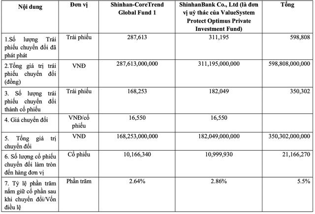Công ty cho biết đã nhận được đề nghị chuyển đổi 350.302 trái phiếu thành cổ phiếu từ hai Quỹ đầu tư Hàn Quốc là ShinhanBank Co., Ltd (đơn vị uỷ thác của ValueSystem Protect Optimus Private Investment Fund) và Shinhan-CoreTrend Global Fund 1.