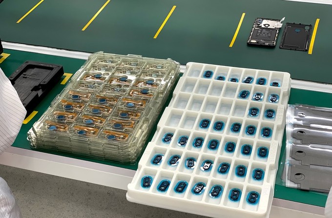 Active 1 sử dụng hệ thống camera kép đặt dọc theo xu hướng chung của thị trường smartphone hiện nay. Trong hình là các mô-đun cảm biến vân tay và phần nắp đậy của camera chuẩn bị được công nhân nhà máy lắp ráp.