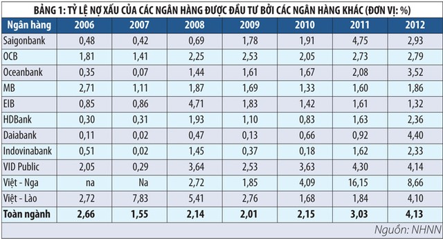 Trong đó, các NHTM nhà nước nắm giữ cổ phần tại các NHTM cổ phần hoặc tại các ngân hàng liên doanh là một trong những hình thức sở hữu chéo đáng lo ngại. Bởi vì các NHTM nhà nước nắm cổ phần có quyền chi phối tại các ngân hàng này, khiến các ngân hàng chịu ảnh hưởng trong các quyết định cho vay. Số liệu thống kê (Bảng 1 và Bảng 2) cho thấy, những ngân hàng liên doanh có tỷ lệ vốn sở hữu nắm quyền kiểm soát của các NHTM nhà nước có tỷ lệ nợ xấu cao hơn so với toàn ngành. Trong khi đó, các NHTM cổ phần có tỷ lệ vốn sở hữu không nắm quyền kiểm soát có tỷ lệ nợ xấu thấp hơn so với toàn ngành.
