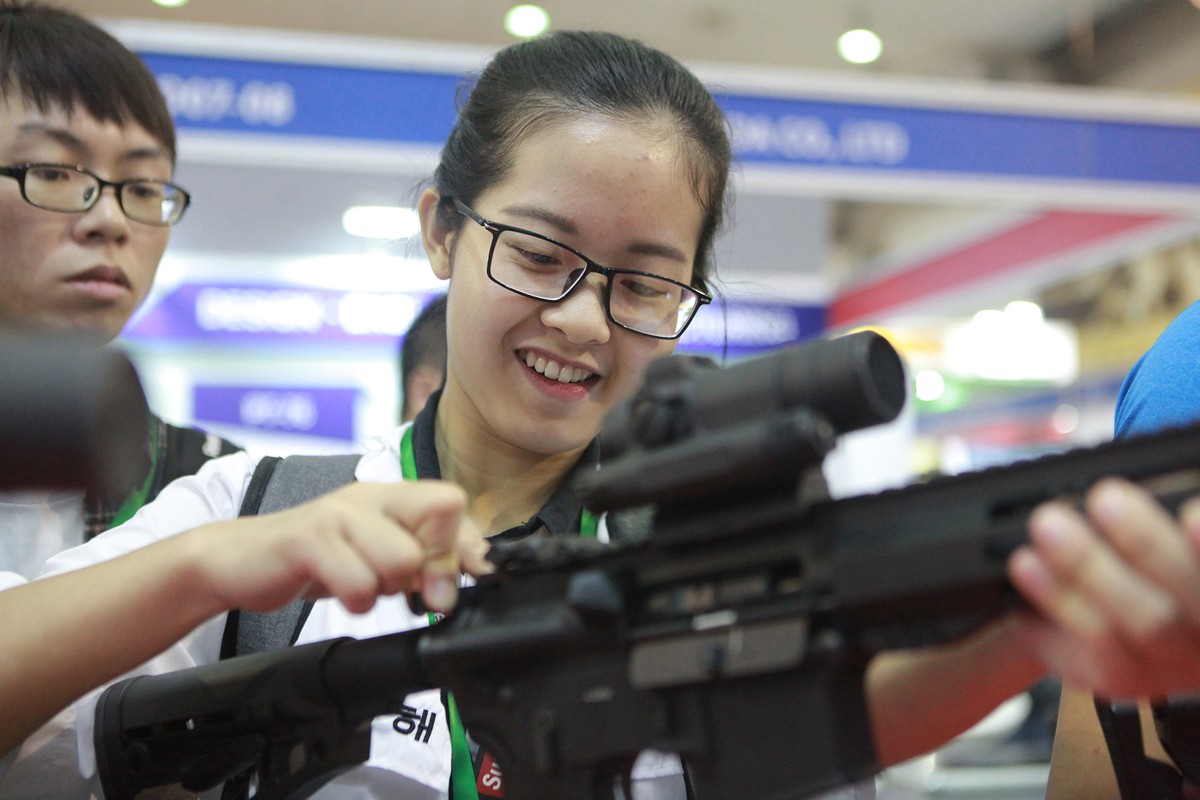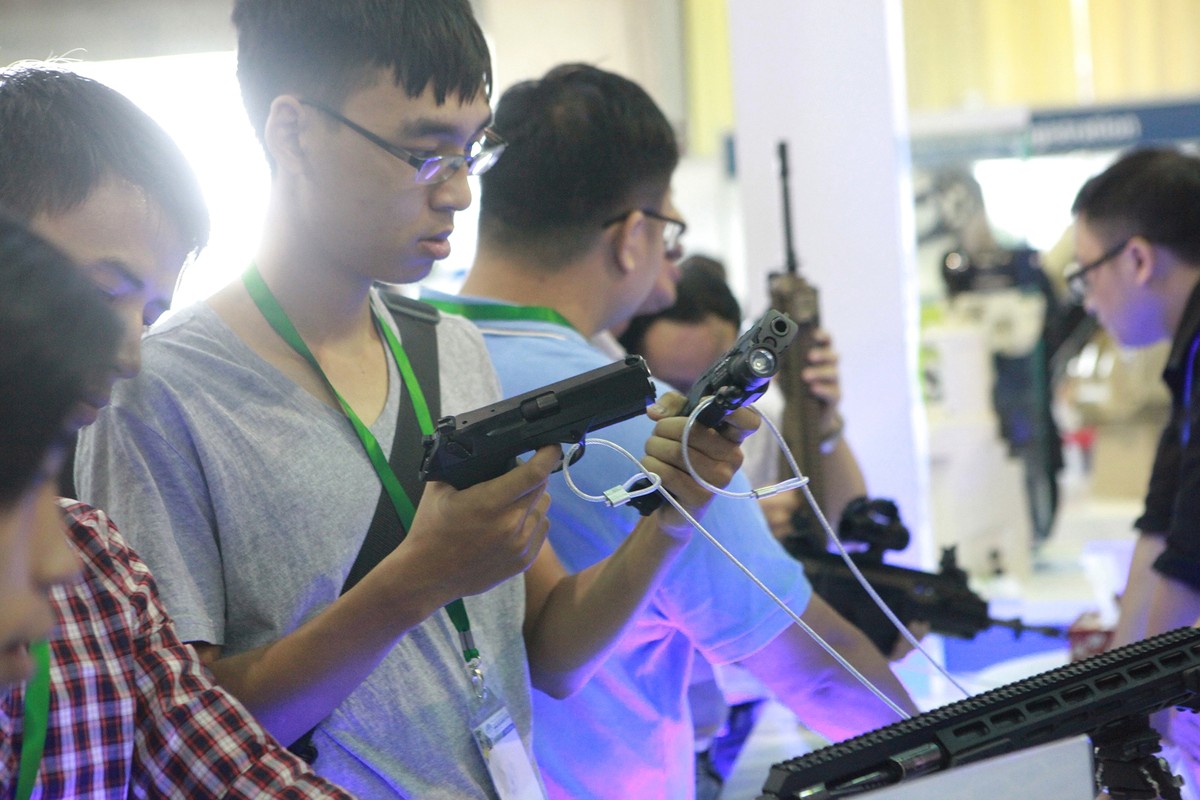 Đến tham quan triển lãm, nhiều người được lần đầu cầm vào một khẩu súng thật và thoải mái ngắm nghía.
