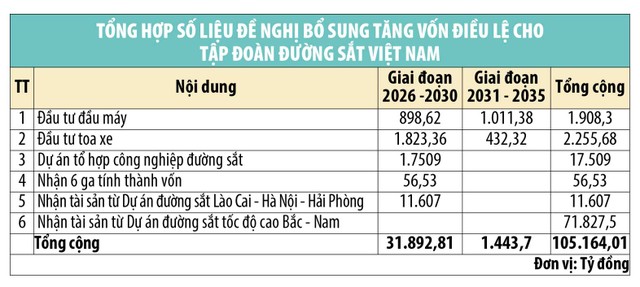 VNR cũng đề nghị Bộ Tài chính báo cáo các cấp có thẩm quyền xem xét phê duyệt bổ sung vốn điều lệ của Tổng công ty với vai trò mới là Tập đoàn Đường sắt Việt Nam giai đoạn 2026 - 2035 với kịch bản 1 là 107.241,29 tỷ đồng; với kịch bản 2 dự kiến là 35.413,79 tỷ đồng.