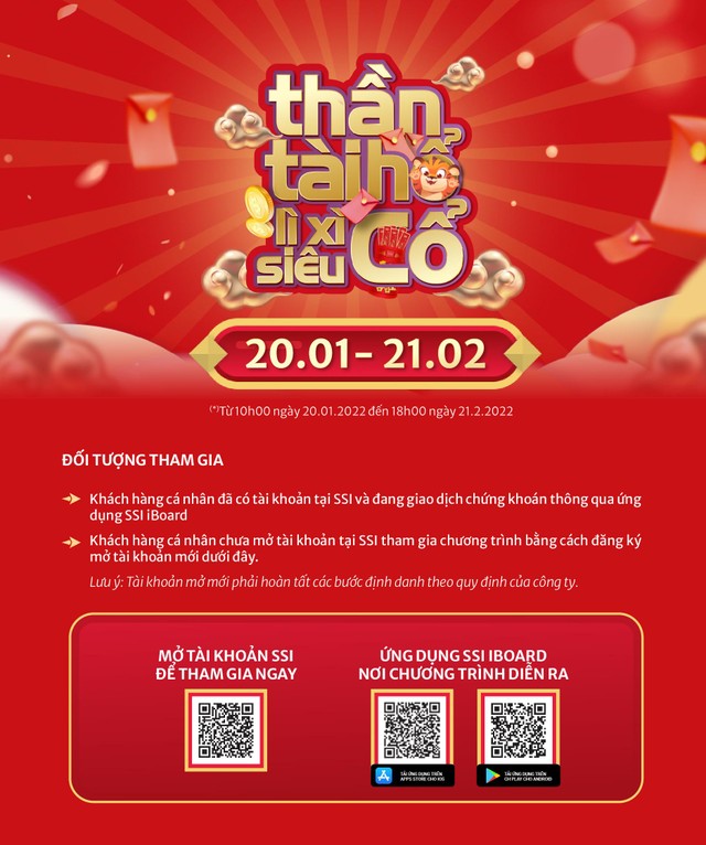 (ĐTCK) Hàng nghìn lì xì chào xuân nạp thẳng vào tài khoản điện thoại cũng như các mã chứng khoán may mắn sẽ được “Thần tài Hổ” trao tặng cho nhà đầu tư tham gia chơi game “Soi mã thần tài” trên ứng dụng giao dịch SSI iBoard.