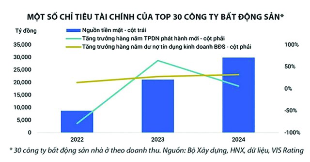 Báo cáo cập nhật kết quả kinh doanh cả năm 2024 của 30 doanh nghiệp bất động sản nhà ở niêm yết lớn nhất theo doanh thu do VIS Rating thực hiện cho thấy, nguồn tiền mặt của ngành đã tăng 46% so với cùng kỳ năm trước và đạt mức cao nhất trong 5 năm qua, nhờ vào dòng tiền mạnh mẽ từ hoạt động đầu tư và tài chính.
