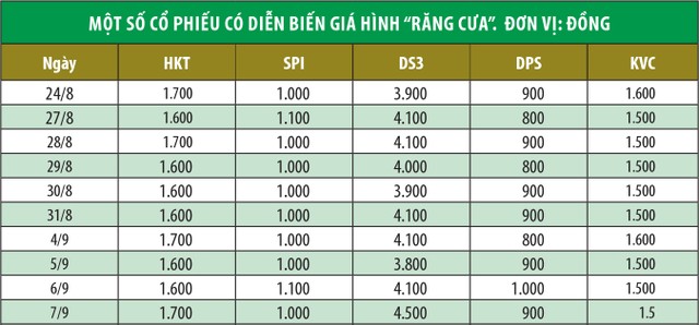 Theo anh Hà, trên thị trường có không ít mã cổ phiếu khác có diễn biến giá hình răng cưa trong vùng giá thấp và nằm trong tầm ngắm đầu tư của anh như DPS của Công ty cổ phần Đầu tư Phát triển Sóc Sơn, KVC của Công ty cổ phần Sản xuất xuất nhập khẩu Inox Kim Vĩ, ACM của Công ty cổ phần Tập đoàn Khoáng sản Á Cường, DS3 của Công ty cổ phần Quản lý đường sông số 3, HKT của Công ty cổ phần Chè Hiệp Khánh, SPI của Công ty cổ phần SPI, SBS của Công ty Chứng khoán Ngân hàng Sài Gòn Thương Tín…