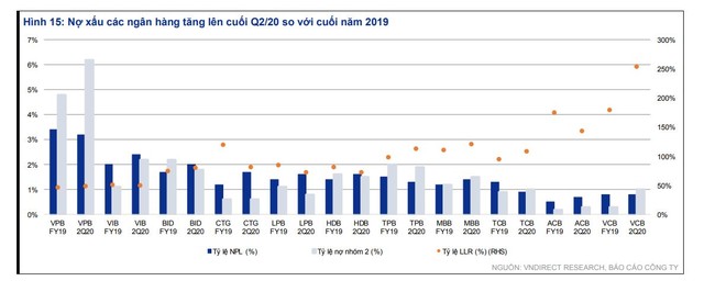 Trong khi đó, báo cáo của VNDIRECT cho biết, nợ xấu và nợ nhóm 2 tăng cao đã phủ bóng lên nhiều ngân hàng vào cuối quý II/2020. Vấn đề này được dự báo sẽ tiếp tục kéo dài nửa cuối năm còn lại đến năm 2021, vì các ngân hàng có thể cơ cấu lại các khoản cho vay giải ngân trước ngày 23/1/2020, lên đến 12 tháng, mà không cần phân loại lại thành nhóm cho vay rủi ro hơn, nhưng những khoản này có thể phản ánh trên bảng cân đối kế toán thời gian tới.