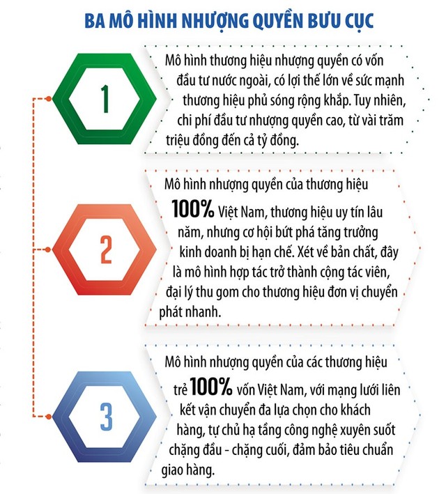 Hiện nay, thị trường có nhiều mô hình nhượng quyền bưu cục với cách thức vận hành khác nhau, có mô hình yêu cầu mức phí nhượng quyền khá thấp, dưới 50 triệu đồng; lại có mô hình chi phí đầu tư lên đến hàng tỷ đồng (bao gồm phí nhượng quyền, phí cọc, phí đầu tư kho bãi, xe trung chuyển…). Nhiều mô hình còn buộc đại lý nhận nhượng quyền phải giao hàng thay cho đơn vị vận chuyển, khi có đơn hàng về địa phương. Các đơn hàng này không có lợi nhuận và thường đòi hỏi tỷ lệ giao hàng thành công rất cao. Đại lý có thể bị phạt nếu phát sinh giao hàng không thành công (có thể lên tới 85%).