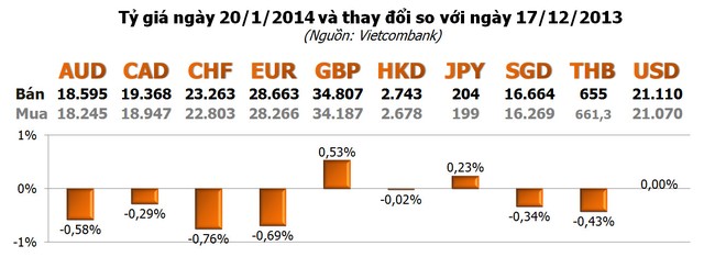 Với các ngoại tệ khác, tiếp tục chỉ có GBP và JPY tăng giá, lần lượt là 0,53% và 0,23%. Các ngoại tệ còn lại đều giảm, trong đó CHF giảm mạnh nhất với -0,76%; tiếp đến là EUR với -0,69%; AUD với -0,58%...