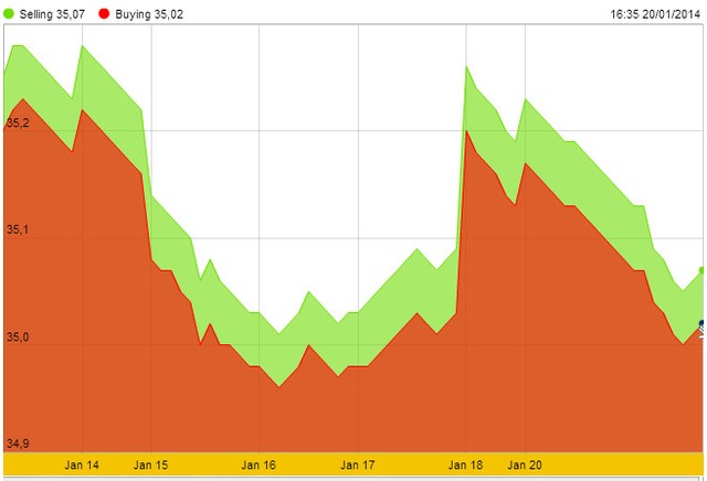 Trong nước, giá vàng SJC mở đầu ngày giao dịch hôm nay tăng 40.000 đồng/lượng lên 35,17 - 35,23 triệu đồng/lượng. Tuy nhiên, sau đó, giá giảm một mạch 170.000 đồng/lượng xuống mức thấp nhất trong ngày là 35,00 - 35,05 triệu đồng/lượng. Chốt ngày, giá tăng trở lại 20.000 đồng lên 35,02 - 35,07 triệu đồng/lượng, giảm 120.000 đồng/lượng so với cuối tuần trước. Như vậy, giá vàng SJC đang có diễn biến ngược giá vàng thế giới. Giá vàng thế giới quy đổi là 31,98 triệu đồng/lượng.
