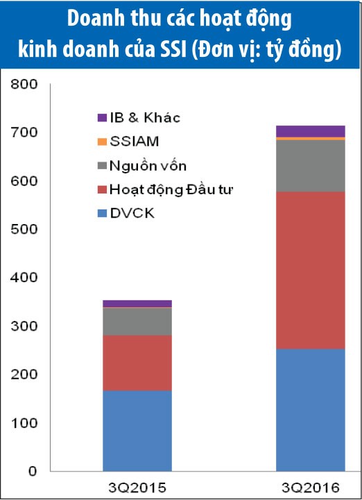 (ĐTCK) CTCP Chứng khoán Sài Gòn (SSI) vừa công bố kết quả kinh doanh hợp nhất quý III/2016. Theo đó, doanh thu quý III đạt 713,67 tỷ đồng, tăng 102%; lợi nhuận trước thuế đạt 440,27 tỷ đồng, tăng 133% so với cùng kỳ năm ngoái.