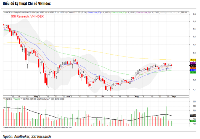 Trong báo cáo chiến lược tháng 9, SSI Research đánh giá, sau nỗ lực cân bằng trong tháng 7, thị trường chứng khoán Việt Nam bước sang tháng 8 lạc quan và sôi động hơn. Sang tháng 9, xu hướng của VN-Index sẽ phụ thuộc vào kết quả kiểm định lại vùng kháng cự 1.285 điểm. Nếu chinh phục và duy trì ổn định trên mốc 1.285 điểm kể trên, chỉ số sẽ mở rộng đà hồi phục lên vùng 1.300 - 1.310 điểm. Ngược lại, nếu chỉ số điều chỉnh trở lại từ vùng 1.285, SSI Research nhận thấy khu vực 1.220 điểm là vùng hỗ trợ tốt cho chỉ số.