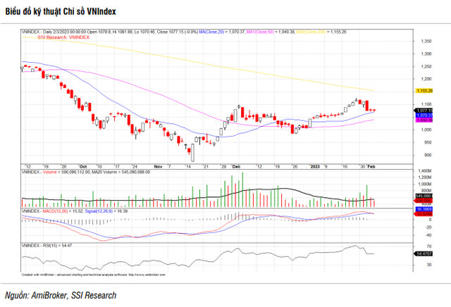 Theo đó, vận động của thị trường trong tháng 2 sẽ phụ thuộc vào khả năng kiểm định MA 20 ngày của chỉ số VN-Index. Nếu xây nền và giữ vững MA 20 ngày, khả năng mở rộng đà hồi phục theo xu thế đi lên từ cuối năm 2022 vẫn sẽ được duy trì với vùng mục tiêu 1.100 - 1.125 điểm. Ngược lại, rủi ro điều chỉnh giảm khả năng sẽ quay trở lại với vùng hỗ trợ gần là 1.050 điểm và xa hơn là nền giá 1.000 điểm.