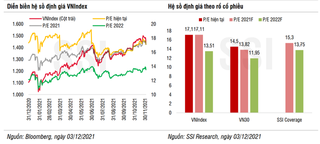 Theo SSI, hệ số định giá P/E hiện tại (trượt 4 quý gần nhất) của VN-Index ghi nhận mức 17,1 lần, ngang bằng mức P/E ước tính cho năm 2021, cho thấy triển vọng tăng trưởng lợi nhuận chung trong quý IV đã chậm lại đáng kể so với các quý trước. Ước tính cho tăng trưởng lợi nhuận của nhóm SSI Coverage (đại diện khoảng 80% vốn hóa HOSE) hiện tại đang ở mức 10,9% so với cùng kỳ.