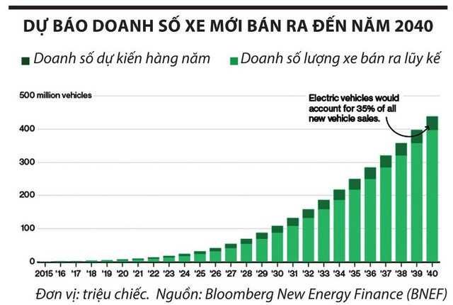 Theo một phân tích mới về thị trường xe điện của Bloomberg New Energy Finance (BNEF), giá pin cho các loại xe điện đã giảm 35% vào năm ngoái và các loại xe điện đang trên đà có giá cả phải chăng như các loại xe chạy xăng trong vòng 6 năm tới. Đó sẽ là bước khởi đầu cho sự bùng nổ thị trường ô tô điện. Theo dự đoán, đến năm 2040, ô tô điện sẽ có giá dưới 22.000 USD và khoảng 35% lượng ô tô mới bán ra trên toàn thế giới sẽ có “phích cắm”.