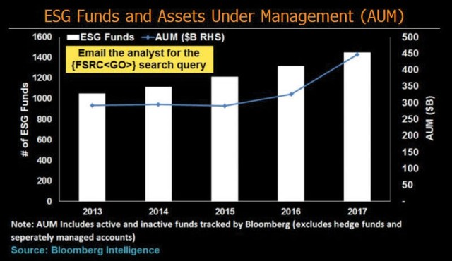 Giá trị tài sản ESG và các quỹ chú trọng hoạt động này đã không ngừng gia tăng kể từ năm 2015 cho tới nay, khẳng định nhu cầu đang gia tăng đối với chiến lược đầu tư này. Năm 2017, tốc độ gia tăng giá trị tài sản ESG đạt 37%, vượt qua mức tăng 23% của chỉ số MSCI Toàn cầu. Tương tự, số lượng các quỹ ESG thành lập năm 2017 cũng tăng gấp đôi năm 2014, với động lực chủ yếu từ sự leo dốc của số lượng các quỹ ETF.