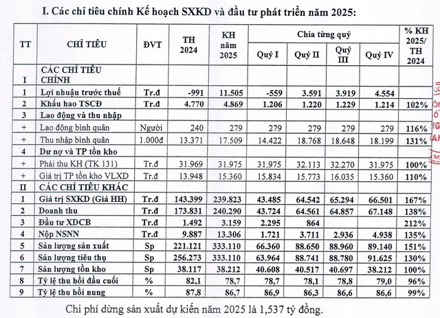 Theo dự thảo tài liệu Đại hội, Công ty cho biết, năm 2025 đặt mục tiêu doanh thu đạt hơn 240,2 tỷ đồng, tăng 38% so với thực hiện của năm 2024, trong đó doanh thu phần sứ là hơn 188 tỷ đồng, tăng 47%; lợi nhuận trước thuế đạt 11,5 tỷ đồng, cải thiện mạnh mẽ so với khoản lỗ 991 triệu đồng năm 2024. Dư nợ phải thu kế hoạch năm 2025 là 31,97 tỷ đồng (tương đương năm 2024).