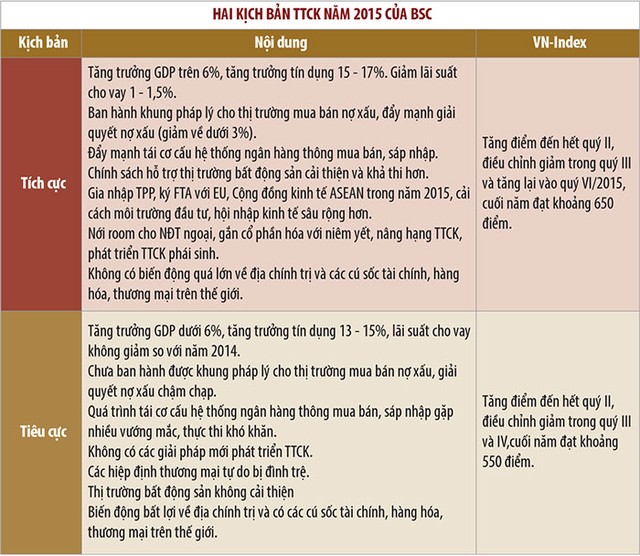 TTCK Việt Nam chịu ảnh hưởng không nhỏ từ những biến động của kinh tế thế giới và động thái của các ngân hàng trung ương Mỹ, Nhật Bản, châu Âu. Tuy nhiên, diễn biến thị trường sẽ phụ thuộc nhiều hơn vào triển vọng kinh tế vĩ mô trong nước và các chính sách của Chính phủ. BSC dự báo hai kịch bản của TTCK năm 2015 trên cơ sở đánh giá các yếu tố vĩ mô và chính sách kinh tế nói chung, trong đó có việc sửa đổi Nghị định 58 (xem bảng).