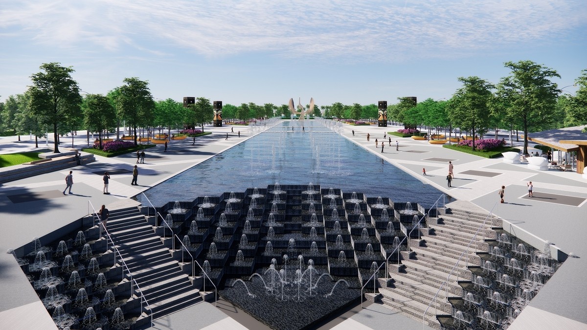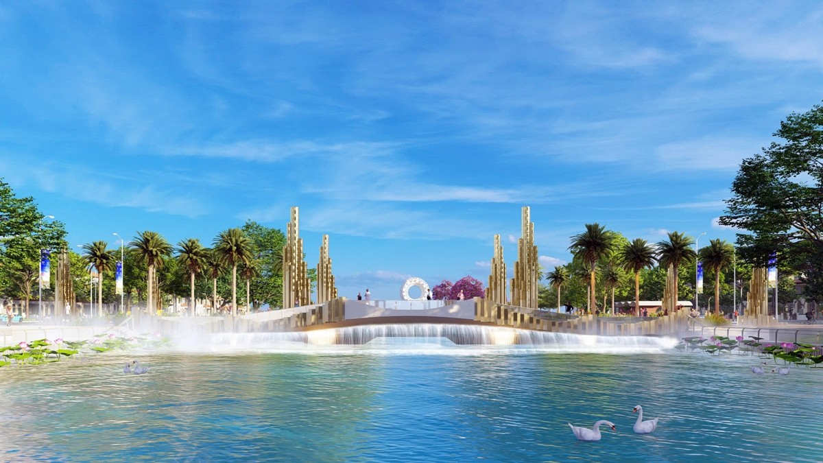 Phối cảnh minh họa Công viên Lễ hội 9ha với trục đại lộ 1,5km và show nhạc nước đẳng cấp thế giới. Ảnh Sun Property |