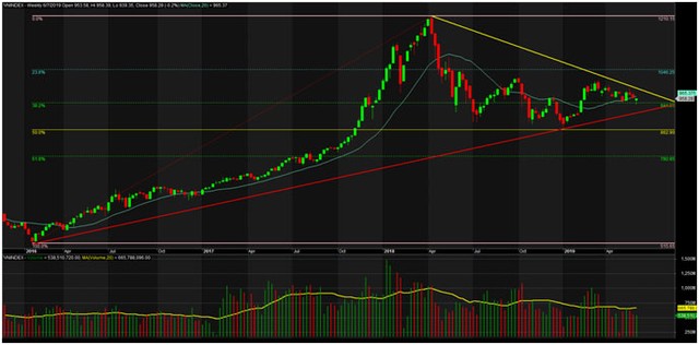 Nếu nhìn dài hơn, chart Weekly. Xét trong giai đoạn từ 2016 đến nay, VN-Index rõ ràng đã tạm thời test xong fibo 38,2% ở khu vực loanh quanh 945 điểm, thách thức trước mắt của chỉ số là đường MA20 (khoảng 965 điểm).