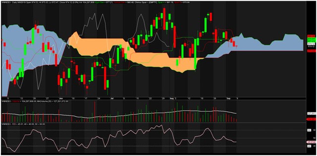 Với hệ thống Ichimoku, cây nến chốt ngày tiếp tục nằm trong đám mây hiện tại, chưa xuyên qua vì khoảng cách có thể cho là vẫn thế, bởi giá đóng cửa không chênh quá nhiều với hôm trước. Các chỉ báo khác của hệ thống không xuất hiện cảnh báo mạnh hơn vì giá biến động quá hẹp, không tạo ra giao cắt nào đáng chú ý hay vị trí tương đối của các đường vẫn gần như được giữ nguyên.