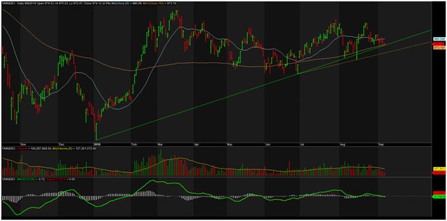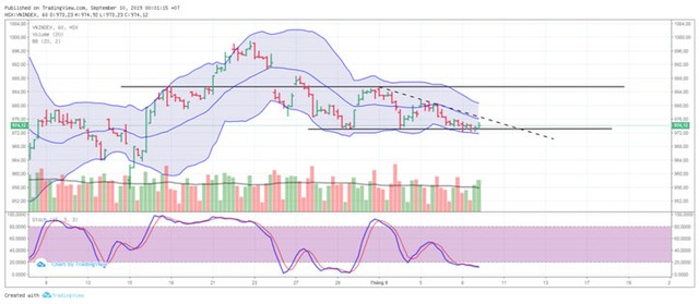 Kết phiên giao dịch ngày 9/9/2019, VN-Index chốt ở 974,12 điểm, tăng 0,04 điểm (+0,00%) với khối lượng giao dịch khớp lệnh đạt 104 triệu đơn vị, giá trị 2.141 tỷ đồng.