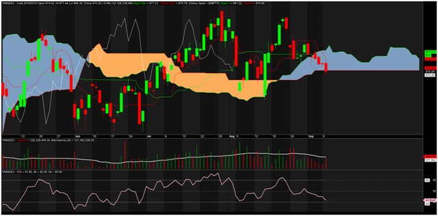 Với Ichimoku, khoảng 2 tháng giao dịch gần nhất giá mới xuyên qua đám mây khiến tình hình thị trường trở lên rất khó khăn. Hơn nữa, đồ thị xuất hiện sự giao cắt tiêu cực của đường Tenkan và đường Kijun cũng là những tín hiệu cảnh báo cực xấu của hệ thống.