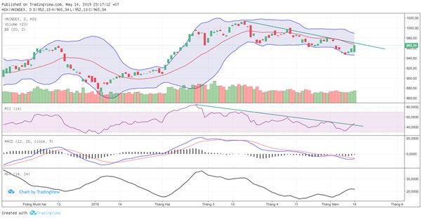 Kết phiên 14/5/2019, VN-Index chốt ở 965,34 điểm, tăng 6,8 điểm (+0,71%) với khối lượng giao dịch khớp lệnh đạt 135 triệu đơn vị cao nhất từ đầu tháng, giá trị 2.912 tỷ đồng. Như vậy, VN-Index đã tăng liên tiếp 3 phiên.
