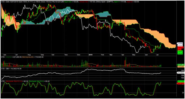 “Soi” CTD qua hệ thống Ichimoku, thì rủi ro lớn nhất là CTD sắp đối diện với đám mây dày đặc phía trước. Hiện tại, bộ 3 giá, Tenkan, Kijun khá hoàn hảo. Tuy nhiên, cả 3 vẫn dưới đám mây khẳng định đây vẫn chỉ là nhịp phục hồi của CTD.