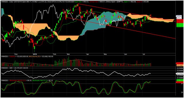 Với hệ thống Ichimoku, giá vẫn nằm trên đám mây nhưng đang có xu hướng quay lại test đường SpanB tầm 973 điểm. Đáng chú ý, có đường Chikou Span đã vượt trên đường giá và sắp vượt luôn cả đám mây, quan trọng hơn là đường Tenkan vẫn có xu hướng bám sát đường giá. Nhìn chung hệ thống này chưa xuất hiện tín hiệu gì đáng phải lo ngại.