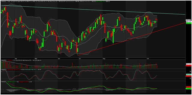 Trên đồ thị, VN-Index rất có thể đang tiếp tục củng cố nền giá quanh khu vực 990 điểm làm bệ phóng cho nhịp tăng bền sắp tới. Tuy nhiên, dòng tiền cần được lôi kéo nhiều hơn nữa ở những phiên tăng điểm ấn tượng làm điểm tựa cho chỉ số vượt qua những thách thức khó nhằn thời gian qua.
