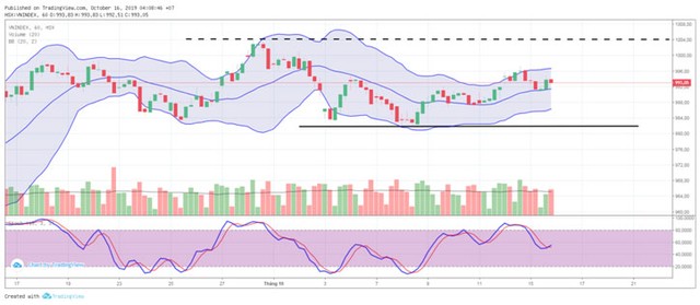 VN-Index đã test thành công MA20 tầm quanh 991 điểm ngay trong phiên giao dịch. Thị trường có lẽ đang lưỡng lự, chờ đợi vì cây nến kết ngày phản ánh khá rõ điều này trên đồ thị. Trong khi giải Bollinger Band đang có xu hướng hẹp lại thì đường MA10 đang cắm xuống cũng thể hiện trong ngắn hạn xu hướng dao động sẽ không nhiều đột phá.