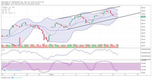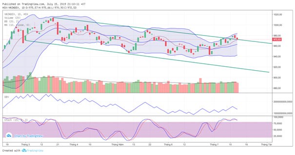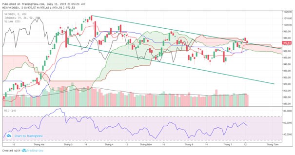 Kết phiên giao dịch ngày 15/07/2019, VN-Index chốt ở 972,53 điểm giảm 2,87điểm (-0,29%) với khối lượng giao dịch khớp lệnh đạt 118 triệu đơn vị, giá trị 2.677 tỷ đồng.