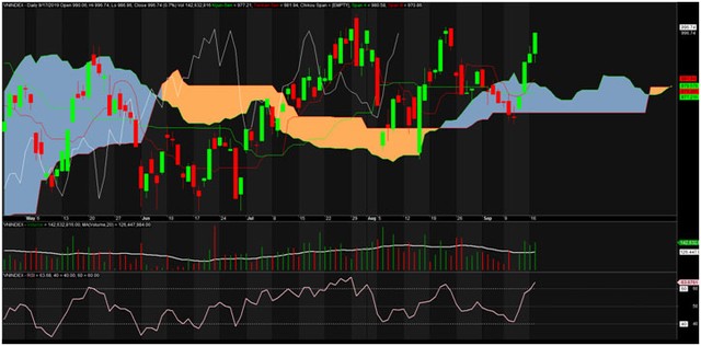 Với Ichimoku, giá đang ở vị thế rất có lợi vì đang ở vị trí cao nhất của hệ thống, đường Tenkan đã vượt qua đám mây và bứt ra xa hơn đường Kijun. Hơn nữa, ở khu vực mây tương lai SpanA đã chính thức cắt lên Span B cũng là những tín hiệu ủng hộ nhịp tăng cho VN-Index.