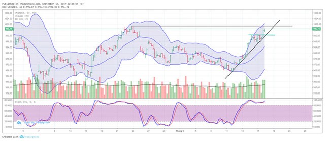 Kết phiên giao dịch ngày 17/9/2019, VN-Index chốt ở 996,74 điểm, tăng 6,88 điểm (+0,7%) với khối lượng giao dịch khớp lệnh đạt 143 triệu đơn vị, giá trị 3.060 tỷ đồng.