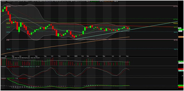Trong bối cảnh giông bão của tuần 12/8 - 16/8, VN-Index vẫn tăng 0,6% với khối lượng khớp lệnh duy trì trên trung bình 20 phiên là tương đối ổn. Trên đồ thị, việc giá đóng cửa chốt tuần nằm trên MA20 (972) sau khi test đáy kênh tầm 955-956 rõ ràng là một tín hiệu tốt. Tuy nhiên, về tổng thể tuần vừa qua cũng chỉ là tuần phục hồi nhẹ sau 2 tuần giảm liên tiếp của thị trường.