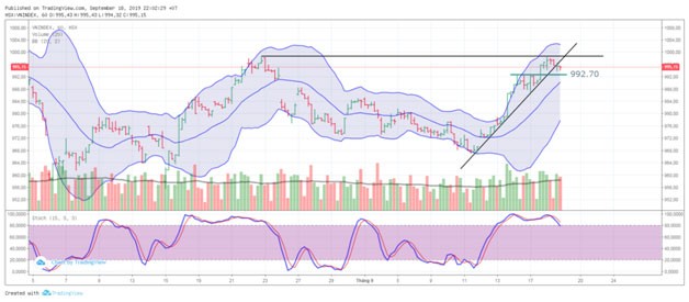 Kết phiên giao dịch ngày 18/9/2019, VN-Index chốt ở 995,15 điểm, giảm 1,59 điểm (- 0,16%) với khối lượng giao dịch khớp lệnh đạt 141 triệu đơn vị, giá trị 3.149 tỷ đồng.